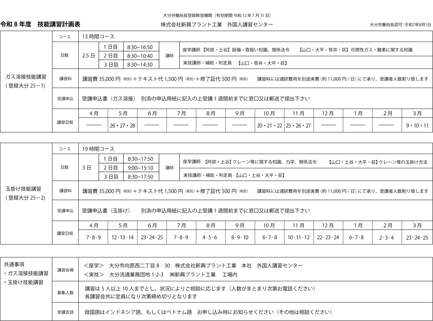 | 講習会場 | <座学> ㈱新興プラント工業 本社 外国人講習センター 大分市向原西二丁目8‐30